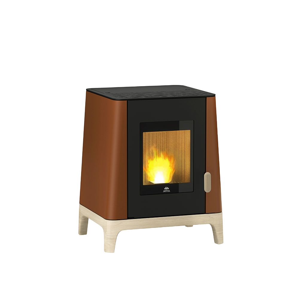 The PF 501 has a slightly trapezoidal silhouette that sets it apart from the box-like proportions of many pellet stoves. Natural wood handles and a wood-finish base add warmth and texture to the design, while the air vents running across the body give it a distinctive, considered look. As a result, it feels more like a piece of furniture than a heating appliance — which is very much in keeping with the Jøtul philosophy.