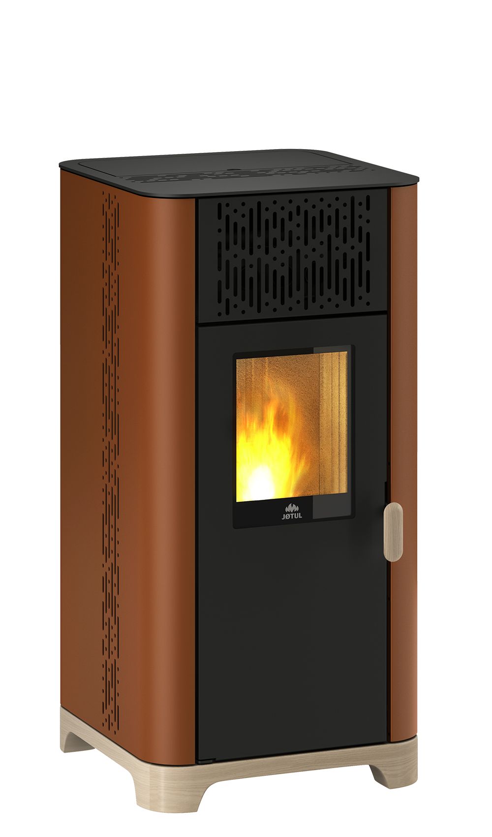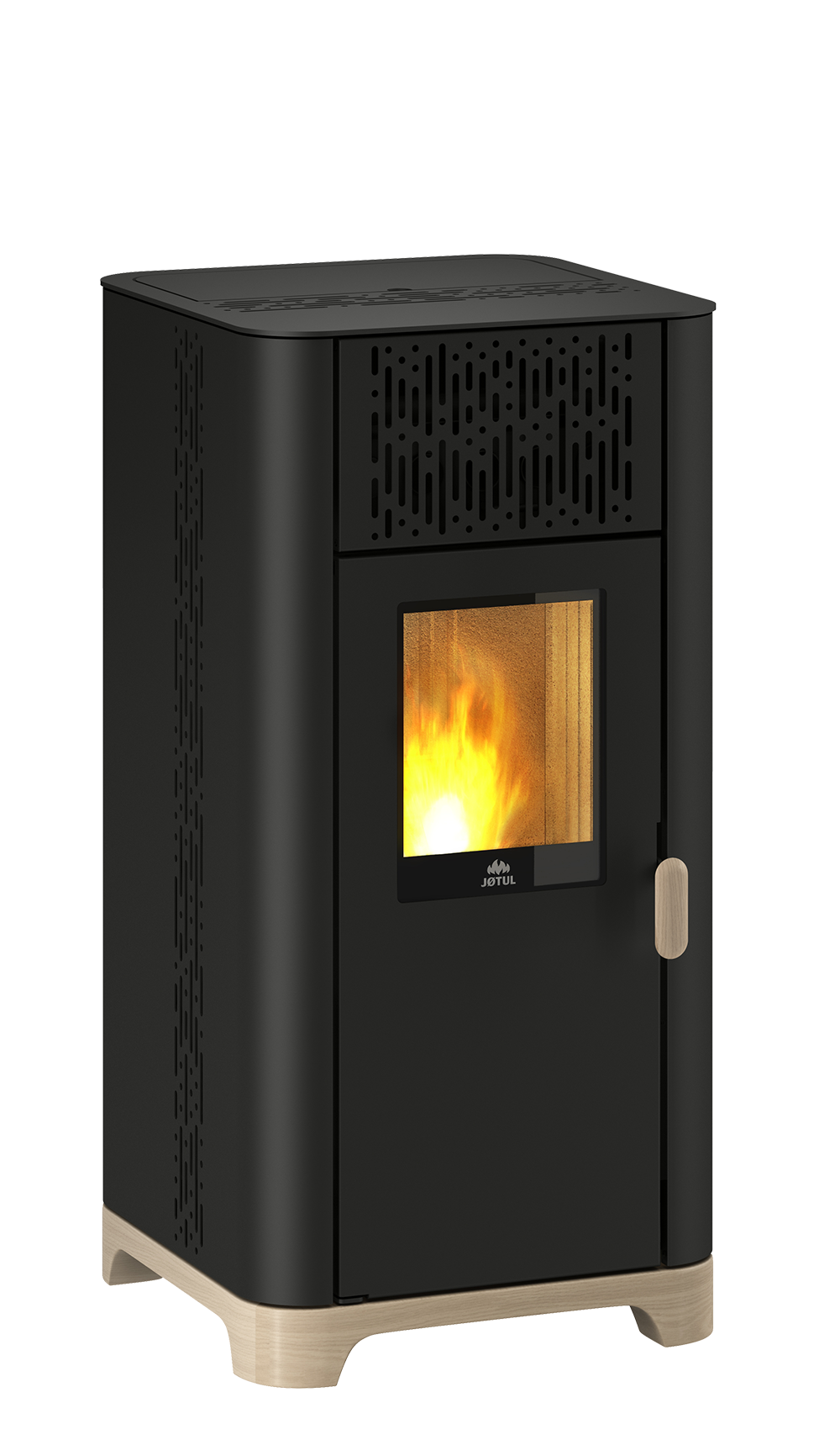 The PF 734 has a clean, unhurried design that reflects Jøtul’s Norwegian heritage without drawing unnecessary attention to itself. Air vents running across the body add a subtle visual texture, while natural wood handles and a wood-finish base bring warmth and character to what could otherwise be a purely functional appliance. Because of these details, the stove feels well resolved and genuinely appealing — the kind of design that improves with closer attention rather than relying on bold gestures.