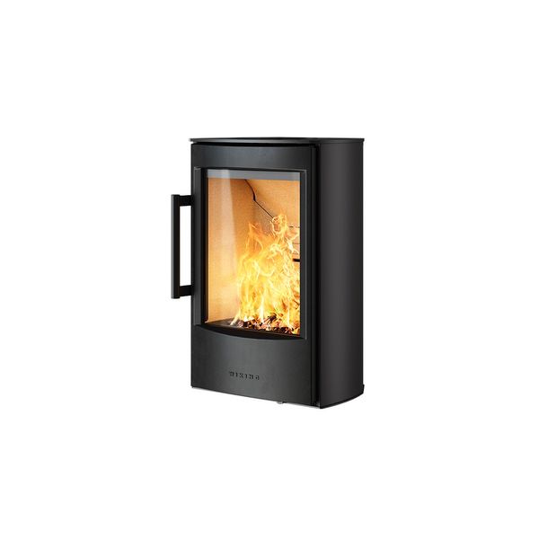 The WIKING Miro 2+ wood burning stove shares its output and combustion system with the Miro 1+ — but takes a different design direction. Where the Miro 1+ uses a side glass panel to extend the flame view around one corner, the Miro 2+ focuses everything on a clean, front-facing glass door. As a result, it feels calm and composed — and fits more easily into alcoves, recesses, and tight wall positions where a side glass stove simply would not work.